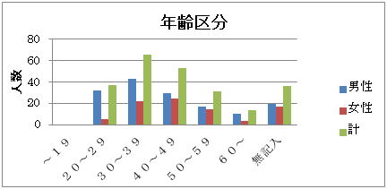 19才以下が0%、20代が15.7%、30代が27.7%、40代が22.6%、50代が13.2%、60才以上が5.5%であった。