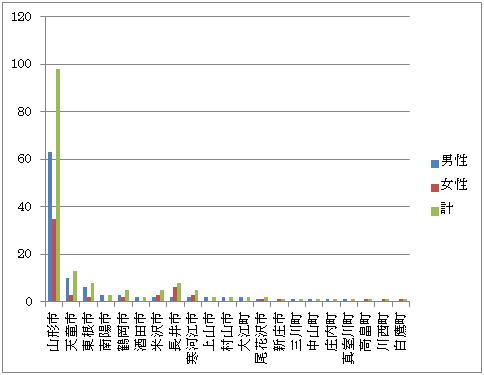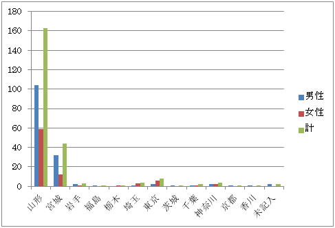 地元山形県が163名(69.4%)、宮城県が44名(18,7%)、東京都8名(3.4%)、神奈川・埼玉県が4名(1.7%)であった。 |
